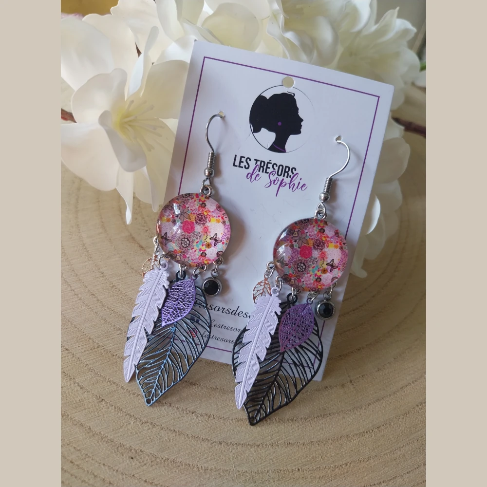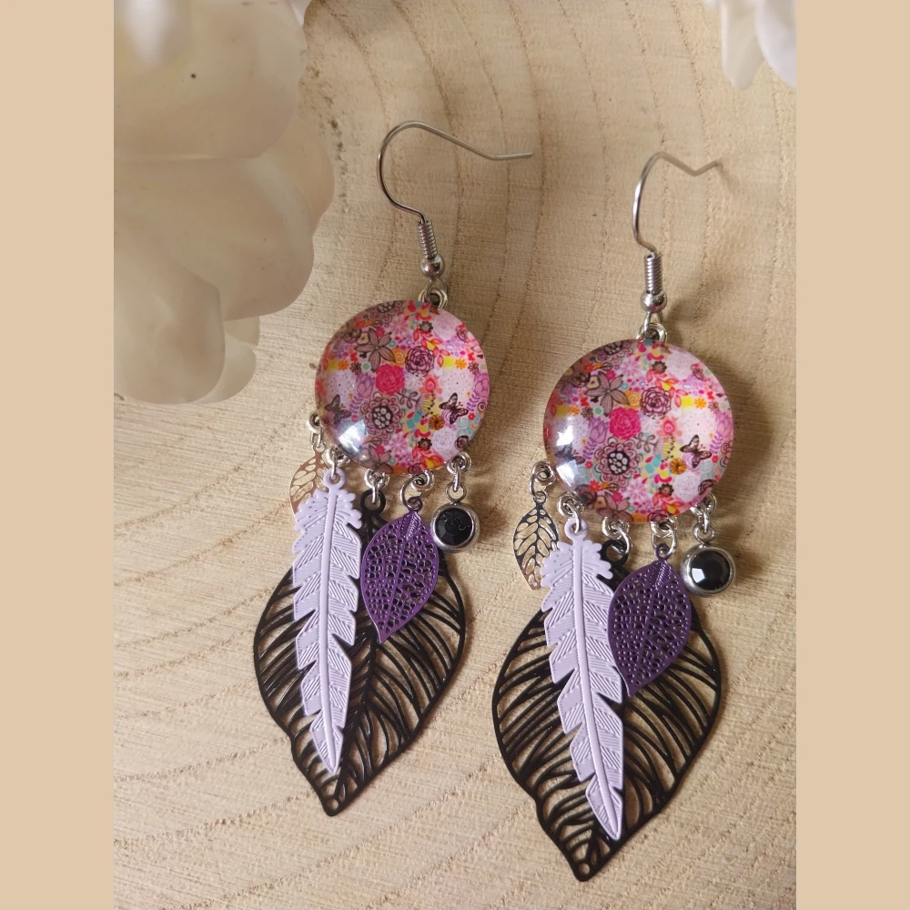 Montées sur une délicate base argentée, des crochets en acier inoxydable hypoallergénique pour toujours protéger vos oreilles, elles dévoilent un jeu raffiné de fleurs et de papillons, où se mêlent profondeur du noir et l’éclat mystérieux du violet.
