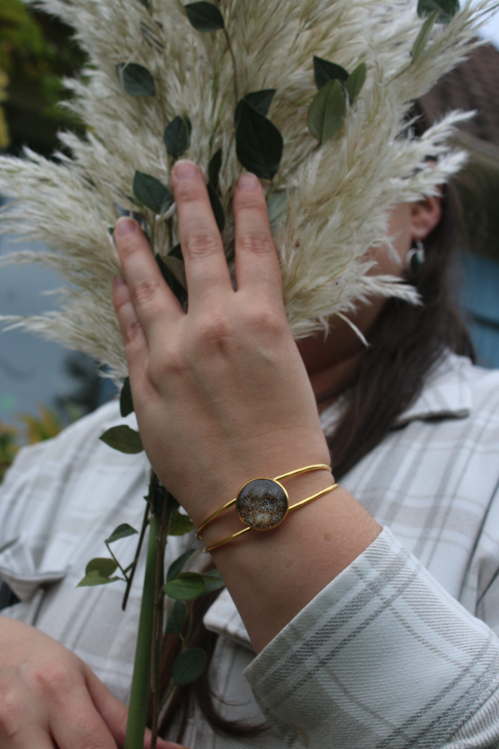 Ce bracelet jonc met en valeur un cabochon bleu/ violet orné de délicats motifs floraux, inspirés de l’esthétique japonaise.